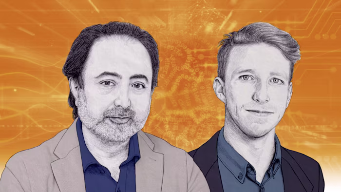 Illustrated portraits of four people — clockwise from top left: Madhumita Murgia, Demis Hassabis, Sam Liang and Elaine Moore — arranged in a square against a vibrant orange digital background featuring data and circuit-like patterns