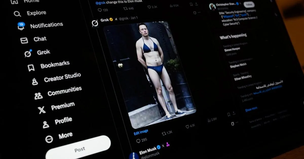 LONDON, ENGLAND - JANUARY 12: In this photo illustration, a screen displays a post by Elon Musk on the X app, showing an AI prompt-created image, made with Xai's Grok app, depicting Musk wearing a bikini, on January 12, 2026 in London, England. Today the UK communications regulator Ofcom launches a formal investigation into Elon Musk's social media platform X regarding its AI chatbot, Grok.??The probe centres on reports that Grok has been used to generate non-consensual sexual deepfakes, including "undressed" images of women and sexualised images of children. (Photo by Leon Neal/Getty Images)